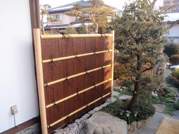 自分も、ちょこっと不安になったのですが、出来上がると本物のよう。竹垣はよく見るのですが、この桧皮垣は始めて、素晴らしい感じです。 こちらは両面仕上げの裏側です。 |