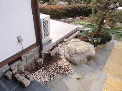 | まず、石灯籠と茶筅垣の撤去です。 | 擬木を建てるための、コンクリート製の足を行けるための穴を掘ります。 | コンクリート製の沓石を据える。 |