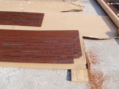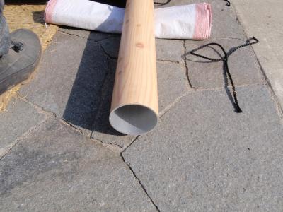 | これが擬木です。アルミの丸パイプに木目のプリントがしてあります。 | こちらは、樹脂の竹と桧皮です。 | 単品で桧皮を見ると、苔に見えるような、青緑色の塗装も有り、妙な光沢が有り、さてどうなることやら?って感じです。 |