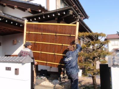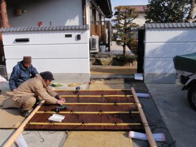 | 製品のままだと、高さが1m80cmも有り、圧迫感があるので、切り縮めて調整します。 | アルミの下地材に、桧皮をビス留め、組み立てていきます。 | ビスを隠すように、竹の桟を取付、紐も取り付けます。この作業が大変、本式の縛り方で時間がかかります。 |