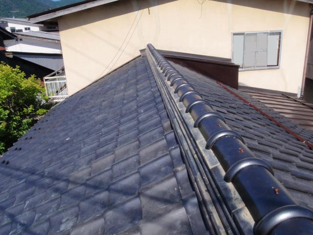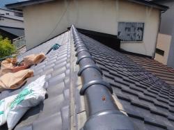 | 棟瓦を二つに割って、真ん中にシリコン入り防水モルタル、鉄筋を入れブロックを積むような感じで、棟を積み上げます。 | 本棟が終わり、下り棟の積み直し作業です。 | まっすぐに棟が積み上がりました。 |