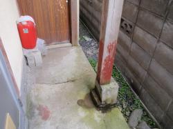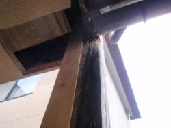 | 一番気になる部分、2階を受ける角柱。 雨樋が逆勾配のため、絶えず柱が雨水濡れた状態に。既に腐食で危険な状態に。 |