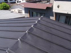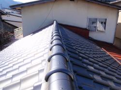 | 耐震工法により、棟のついなおし完了です。 | 下り棟も、積み上がりました。 | 最後jに、1階の屋根の仕上げ塗装を行い完成です。 |