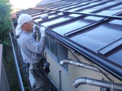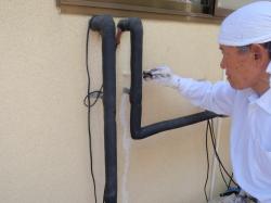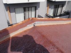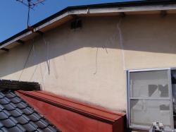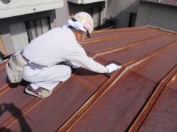 | 2階の壁のヒビも、コーキングで処理します。 | コーキングの上は、壁の色に合わせて塗装します。 | こちらは2階の屋根、いよいよ塗装開始。 まずは、錆をこすり落とす作業からです。 |