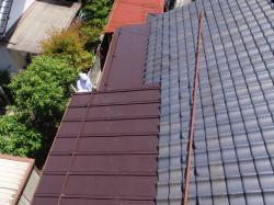 | 下り棟もずれ落ちて、雨水が廻っている状況です。 | 屋根と壁の取り合いも、水切りがなく、モルタルにカビが生えたり、下には土が溜まり苔が生えています。 | 1階の板金屋根もサビが浮き、ぎりぎり限界の状況です。 |