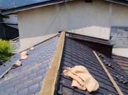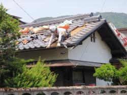 | 逆勾配だった、雨樋を新しく付けなおします。 | 本当は、先にやりたかった瓦工事なのですが、昨年の地震被害の復旧作業などが重なり、直ぐには入れなかったので、後工事にしました。 | 崩れた棟を一度バラシ、耐震工法にて積み直します。 |