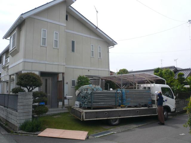 | ようやく先が見えてきました。この部分の塗装が終われば、終わりです。 | 塗装工事が終わった状態です。あとは足場を撤去して完了です。 | 足場を崩していきます。先ずは屋根の足場から気をつけてバラします。あいにくの雨でした。 |
