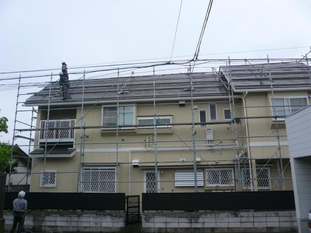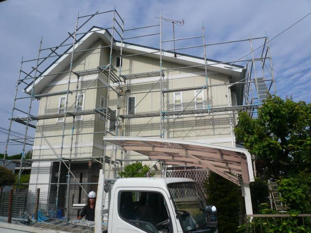 | 初日ですが、先ずは外部の足場を組み立てます。 | 足場の組立は、総勢4人の職人が来て組み立てました。 | 北面の屋根は勾配がキツいので屋根足場も組みます。 |