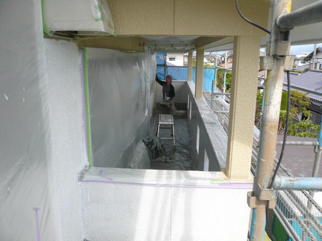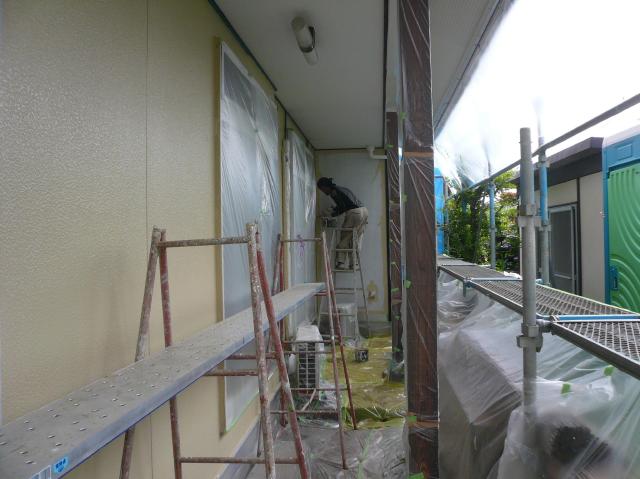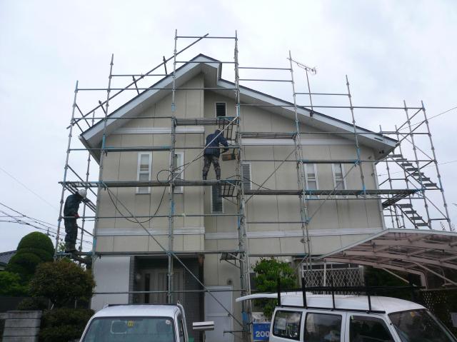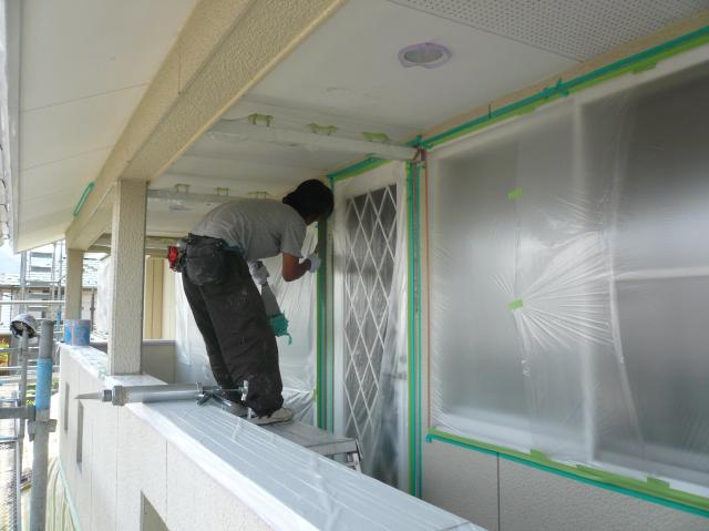 | サッシ廻りや外壁の目地のコーキングを打ち替えいます。 | サッシ部分は汚さないように、養生をして塗装をします。 | 外壁塗装の約半分が終わった所です。毎日暑い日が続いて塗装職人も大変です。 |