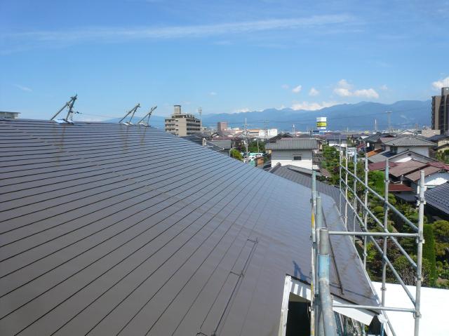 | 足場が組めたので、先ずは屋根と外壁を高圧洗浄で水洗いをします。 | 洗浄が終わったあとは全面に錆止め塗料を塗ります。 | 錆止めが終わったら、仕上げの塗料を塗ります。耐久性のあるシリコン塗料です。 |