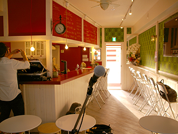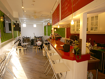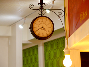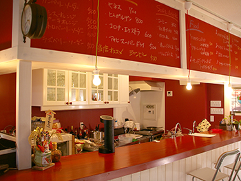 | 店内の雰囲気に合わせ、かわいらしい時計も設置しました。日常空間から別世界に踏み込んだような気持になります。 | カウンタ越しに見る、キッチンです。壁には塗ると黒板になる塗料を使用しました。見せるメニューが素敵です。毎日書き換えるのも楽しそうです。 |