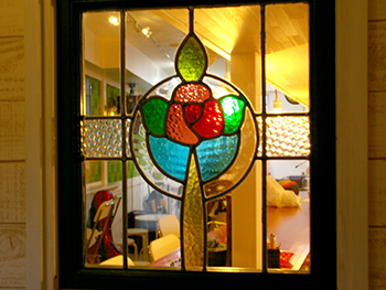 | ステージから店内を一望できるようになっています。ミュージシャンはこのマイクの前に立ち演奏するんですね!お客さんとのコミュニケーションもとることができます。 | 店名にあわせローズのステンドグラスをいれる遊び心も。いよいよ日が暮れて、ライブの始まりです。その向こうに入っていきたくなります。 |