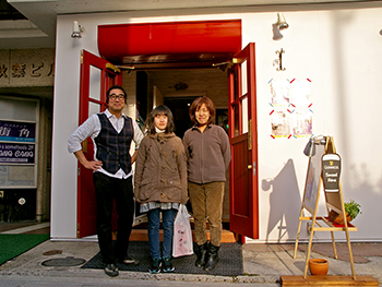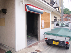 | 前のお店のなごりである、外の床屋さんのようなシャッターも、赤に塗り直します。 | ドアも設置し、大分お店らしい外観になりました。この後ドアも塗装します。 | クロスが終わると、電気にエアコン取付と慌ただしく、完成間近です。 |