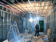 | 残りの解体、コンクリートの斫りと便器の撤去、配管撤去などなどしていきます。設備配管、あまり床を上げたくないため、ぎりぎりの配管です。 | 建物内の上の階に伝わる振動を軽減させるため、ゴム付の天井吊り金物を使用。壁下地ができると、今度は電気配線。配線量が多いため徹夜作業です。 | 壁天井ともコンパネを貼りその上にもう一枚プラスターボード12.5mmを張ります。防音と、物をぶつけても穴が開かないし、何でも留めることができます。 |