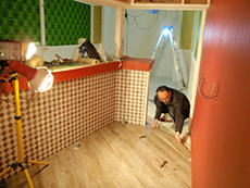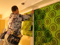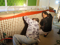 | カウンターの作成!家具屋さん主のだと値段が高くなることもあり、大工さんに現場で作ってもらうことになりました。次はその上の吊り戸棚です。 | M様と奥様...土日曜日のたびに、照明器具や、内装(クロス・床)ドアの事、塗装のこと等打ち合わせることがいっぱいです。大変ですが楽しそうです。 | クロス貼り作業開始です。客席の壁は、ペイズリーとは違う、何というか大きな模様と、それを浮き上がらせる鮮やかなグリーンのクロスです。 |