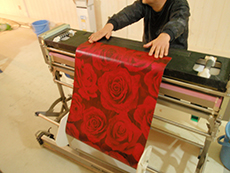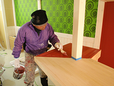| こちらも輸入品の紙クロス。大きなバラの花があっかんです!幅は60cmくらいの貼方は、突きつけ貼りの切り落としは無しです。 | カウンターの塗装、こちらも渋めのアカでアクセントを付けます。壁の色に合わせた色で、ムラにならないよう塗りました。 | カウンターの塗装が完了しました。アクセントカラーが素敵です。 |