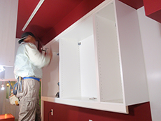 | キッチン部分に棚を設置します。収納力も抜群ですね。厨房機器を設置して完成です。 |