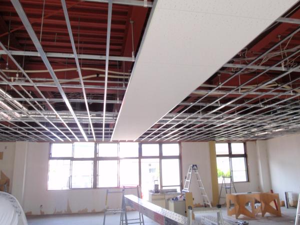 | 電気配線もびっしりあるので、思い切って整理 | 新たに軽量鉄骨の天井下地を組みます | ジプトーンを張り天井は完成 |