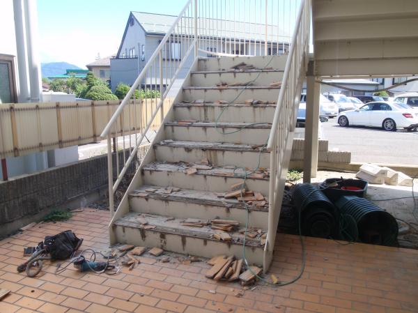 | 壁クロスを張り終了、床は次に入るテナントさんのいいように仕上げをしてもらう予定です | 外階段も、タイルが浮き上がりボロボロ | 撤去後、モルタルで仕上げ、塗り床です |