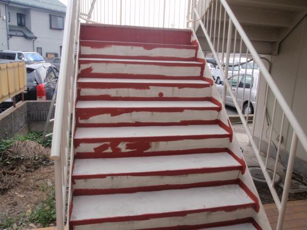 天井と、外周の壁までは仕上げましたが、間仕切りなどは、また次に入られるテナント様のいいように・・・ 今回はここまでです | 外階段も、塗り床仕上げをして完成です。 |