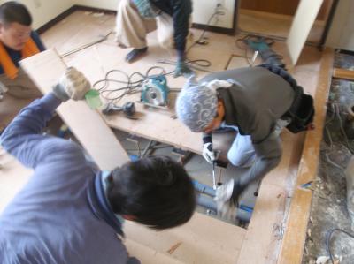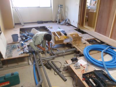 | ユニット配管 給水、排水、電源、エアー、バキューム、LANなど様々な配管配線をします | 従業員トイレの床下を配管が通ってきます | 配管が終わると、床の穴を復旧します |