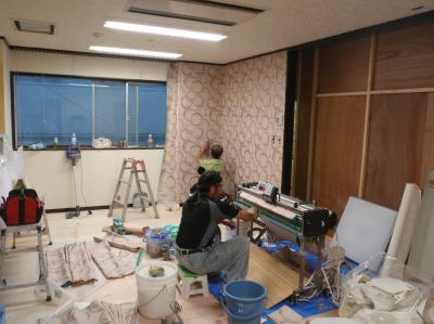 | 内装工事、クロスに、床仕上げを行います | コンサルからの指南、濃い色に塗装します 塗装は、患者さんのいないお盆期間、昼だけでは終わらないので夜間も行います。 |