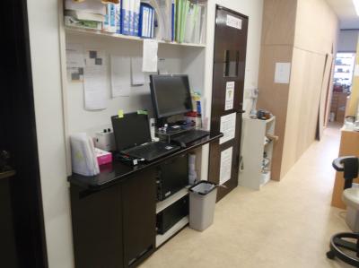 既存のカウンターも塗装、その向こうのレントゲン室のドアも |