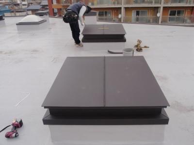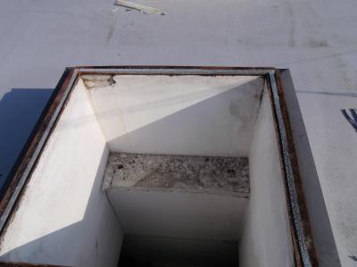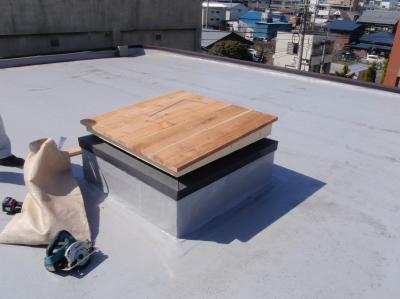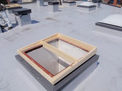 | まずはトップライトを取り外します | 外した状態です。隅の部分から雨漏りのあとが見えます | 木下地を組みます |