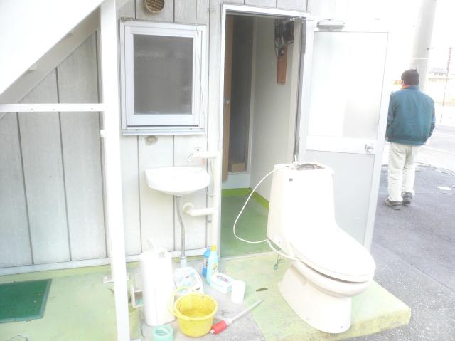 | 設備業者で便器を取り外します。予算を抑えるため、便器は再利用です。 | 解体工事ですが、先ずはロフトを撤去します。ベニヤの向こう側がトイレです。 | 間仕切りを撤去して、床組も撤去します。何もない状態にします。天井は残します。 |