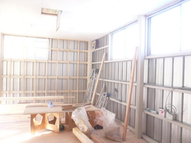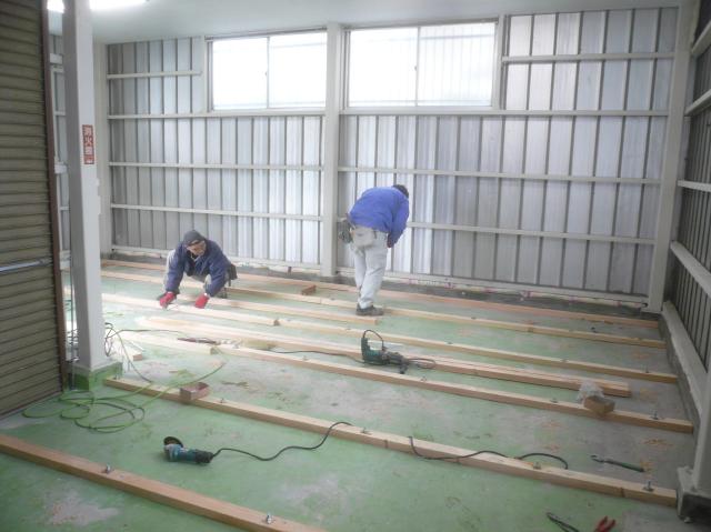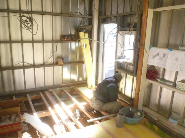 | 床も冷気が上がらないように、根太の間にグラスウールの断熱材を敷き詰めます。 | 床のベニヤを止めていきます。仕上げはクッションフロアで店舗ですので、ベニヤは2重張りです。 | 壁の下地は、鉄骨にビスで固定しながら組んでいきます。 |