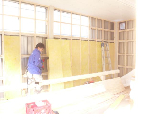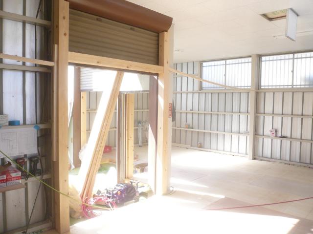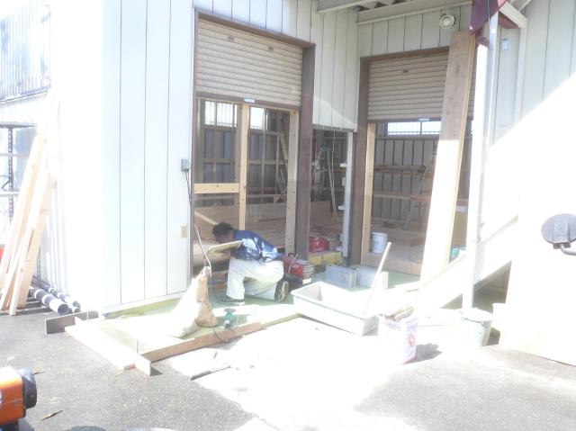| 壁の下地の間にもグラスウールの断熱材を充填していきます。 | シャッターの部分は、出入口になります。アクセントで、檜の柱を見せてイメージを変えます。 | 店舗の入口は増築になるので、左官屋さん基礎の準備をしてもらいます。 |
