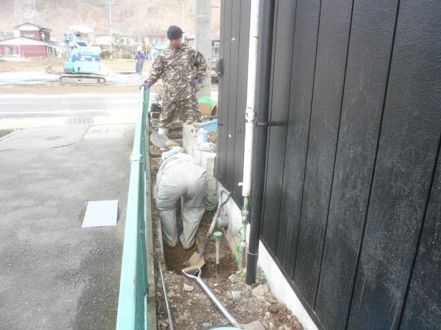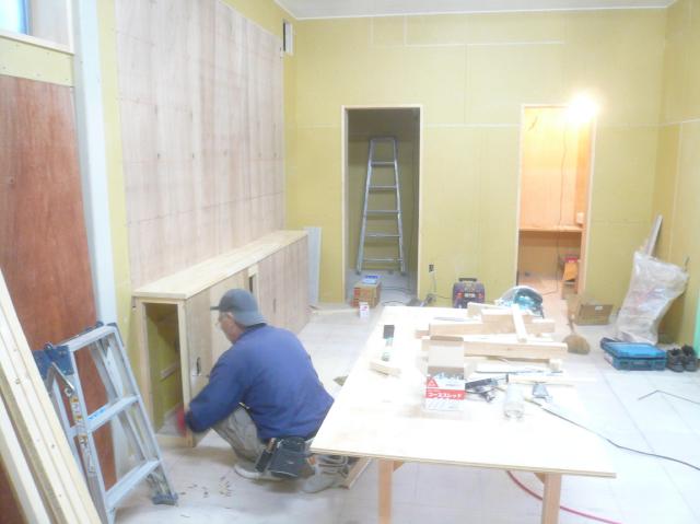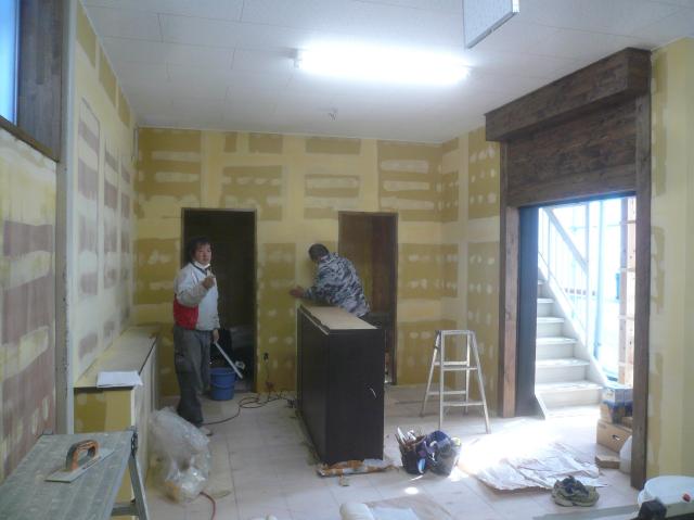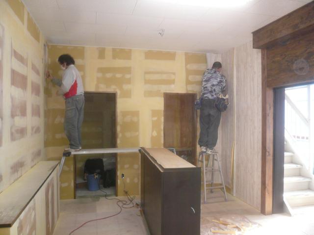 | 店舗入口の増築した部分も黒のサイディング張って仕上げます。 | 設備の排水や給水管を掘りながら、配管します。天気も続いているので、助かります。 | 中では壁のクロスを貼り上げていきます。壁は白い木目調のクロスです。 |