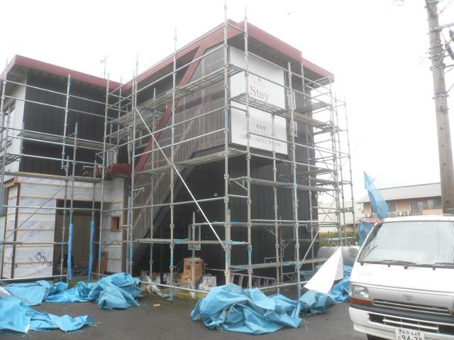 | 外装工事も同時進行で進めていきます。外壁は塗装するので足場を掛けます。まだ外部は設備の配管等が残っています。 | 店長さんのイメージで外壁は黒で決めました。住宅でも最近は黒の仕上げが増えてきています。 | 塗装工事が終わり、足場をバラします。足場を撤去してから外廻りの配管や店舗入口の造作をします。 |