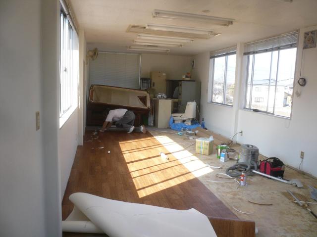 | 床はクッションフロアを張ります。シャンプー台廻は石目調で、カットスペースは木目で張り分けます。 | 入口の木製建具を吊り込みます。建具はまわりに合わせ、ヒノキ材を使っています。塗装をすると木目が出て綺麗です。 | 2階は事務所とお客様の為の、キッズルームとして使用する予定です。床のクッションフロアを張替えます。 |