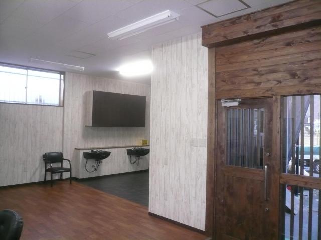 | シャンプー台を取り付ける下準備をします。排水管の位置もシビアなので、取り付け位置を割り付けます。 | 内装工事も終わり、後はオープンの準備をするだけです、何もない状態ですがこれから備品を搬入します。 | 2階のキッズルームです。小さなお子様連れでも、気軽に来れますね。奥が事務所になっています。 |
