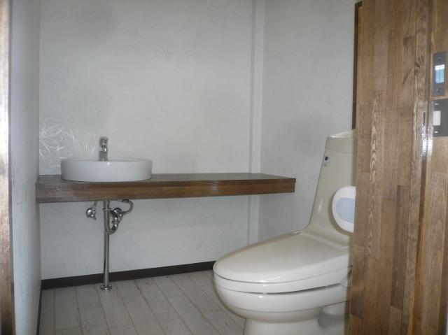 | 窓からの明かりが入り、思った以上に明るいです。入口もアクセントになり落ち着いた雰囲気に仕上がりました。 | 新設したトイレです。パウダールームとしても利用できるように、広いスペースにしてあります。 | 鏡やテーブルなど配置し、美容室らしくなりました。細かい作業には自然光が最適な様です。 |