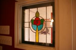| 昼に室内から見たステンドグラス | カウンタ越しに見る、キッチン 上の黒板にメニューが書いてあります。 |