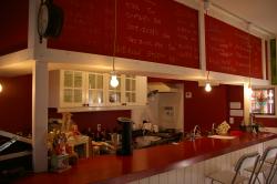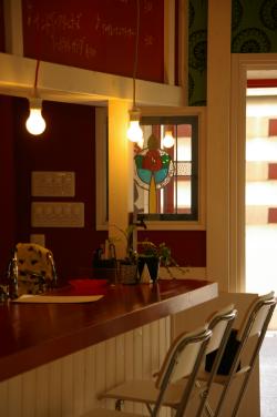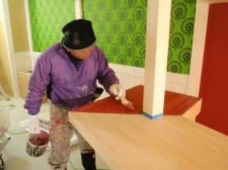 | カウンターの塗装、こちらも渋めのアカでアクセントを付けます。 | カウンター上の壁は、赤い黒板 こちらは、マグネット仕上げではありませんが、それでも4行程の塗装がかかります。 |
