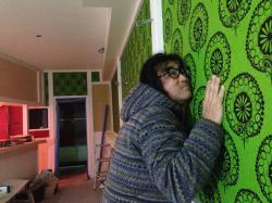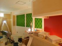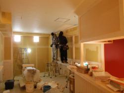 クロス貼り作業開始 カウンター奥は、渋めのアカを基調に仕上げます。 |