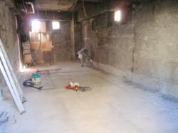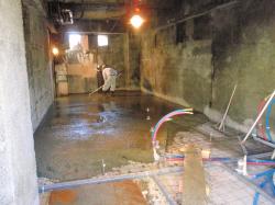 | 残りの解体、コンクリートの斫りと、便器の撤去、配管撤去などなどです。 | 設備配管、あまり床を上げたくないため、ぎりぎりの配管です。 | コンクリート打設、これで床も平らになり歩きやすくなります。 |