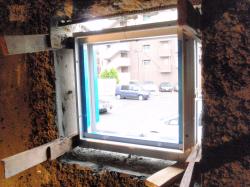 | 当初はつぶしてしまう換気扇の穴、明かり取りの窓が欲しいと、急遽取付! | 建物の外部に逃げる音よりも、建物内の上の階に伝わる振動を軽減させるため、ゴム付の天井吊り金物を使用 | 天井下地ができました。 |