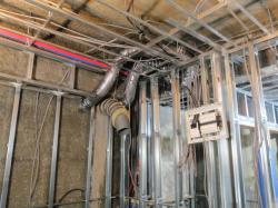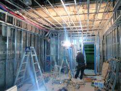 壁下地ができると、今度は電気配線。 配線量が多いため、徹夜作業です。 |
