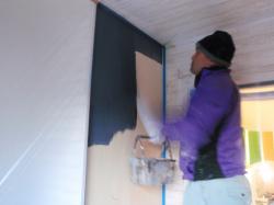 | 壁天井ともコンパネを貼りその上にもう一枚プラスターボード12.5mmを張ります。 防音と、物をぶつけても穴が開かないし、何でも留めることができます。 |
