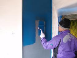 まずは塗装、1回ではとても薄くて、結局5回塗り重ねて下地が完成。5日かかりました。 | それで終わりではありません。 さらにその上に、青い黒板塗料を3回ぬって完了 塗装やさんの苦労の作品です。 |