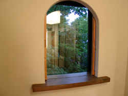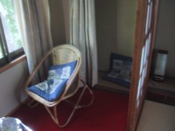 | 廊下も広く、自然素材を使用しました。 | 窓からは緑がみえます。 | 椅子のとなりにはお風呂が取り付けてあります。 |