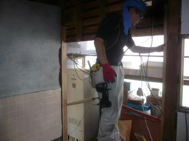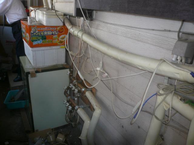 | まずは撤去から。水管お湯管を撤去します。 | リモコンを撤去します。 | 浴室を解体していきます。 |