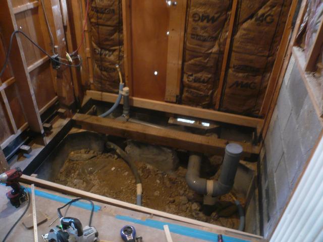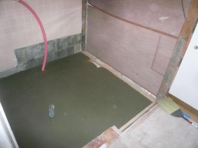 | 設備屋さんに排水管の位置を変えてもらいます。 | お風呂にもお湯管水管、配水管を立ち上げ、コンクリートを流す準備が整いました。 | コンクリートを打ちました。 |