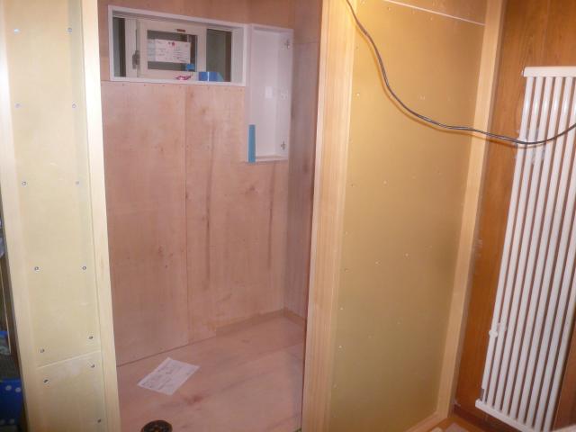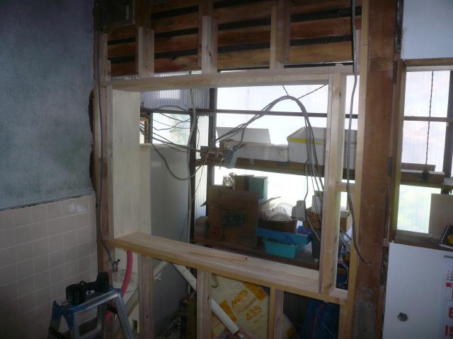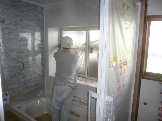 | 壁に断熱材を充填します。 | 石膏ボード、合板で壁を張りました。 | 浴室の窓枠を造ります。 |